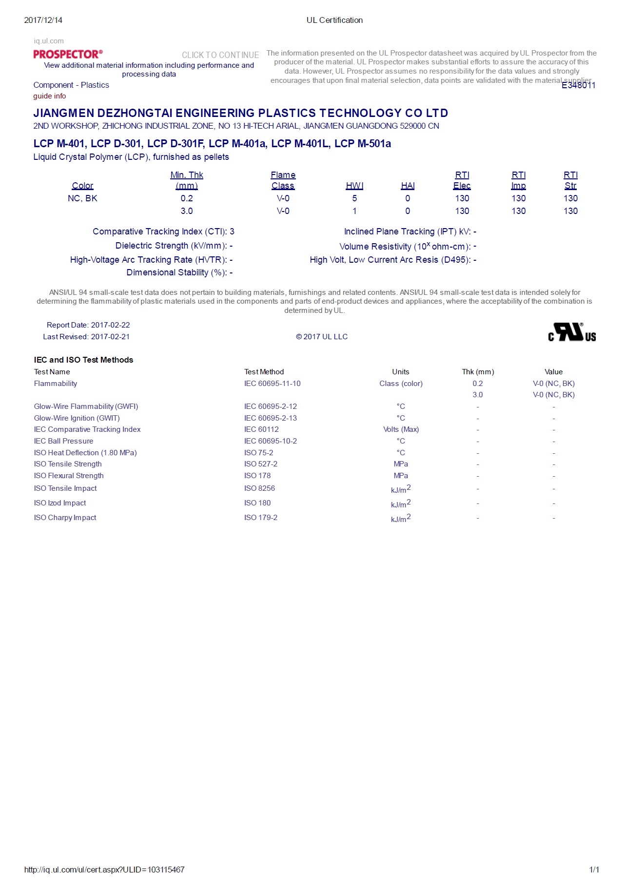 分子鏈由大量芳環(huán)構成,火焰中由于表面形成一層泡沸炭而窒息火焰,因此不加阻燃劑, LCP也具有自熄性,極限氧指數約35%,阻燃性可達UL94 V-0級水平。德眾泰LCP產品最薄可以成型0.2 mm厚度的薄壁制品,并通過了UL94 V-0認證。